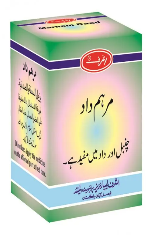 Marham Daad is a topical medicine designed to combat the symptoms of ringworm and psoriasis. It is expertly crafted by ashraflabs, a trusted name in pharmaceuticals. This product contains a blend of natural ingredients known for their therapeutic properties, making it an excellent choice for relieving the itching, redness, and inflammation caused by these skin conditions. Key Ingredients: