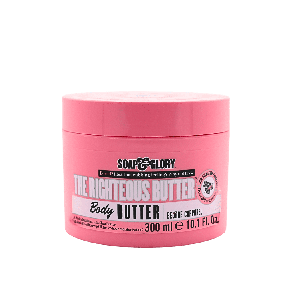 Soap & Glory The Righteous Body Butter is a rich, deeply moisturizing, body butter that's designed to hydrate, soften and restore rough and dry skin. This fast absorbing formula is infused with a rich mixture of aloe vera and coconut oil. It delivers intense hydration, without feeling greasy. The "Original Pink", scent leaves your skin feeling fresh and feminine. It is a must have skincare essential for your daily routine.