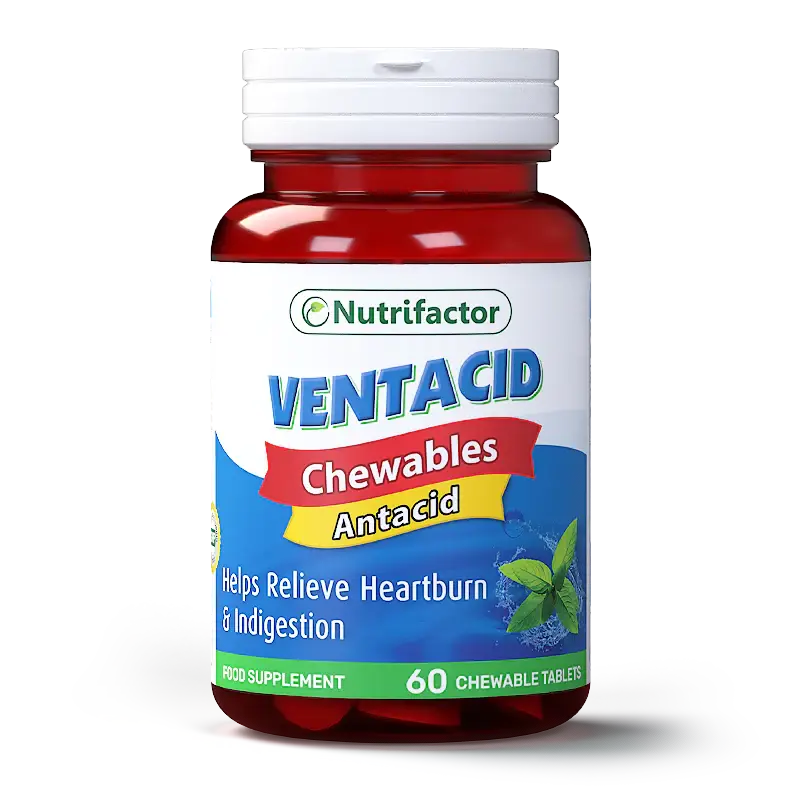 The Nutrifactor’s Ventacid Chewable Tablets are an excellent remedy for quick and immediate relief of heartburn and acid indigestion owing to the presence of Calcium carbonate and Magnesium hydroxide. Both of these powerful antacids combine to alleviate the acid in the stomach thus giving relief to those who suffer from acid reflux and related symptoms. Notably, Ventacid has no adverse impact on your tummy. Moreover, it is rich in calcium and magnesium, which are crucial in your body.